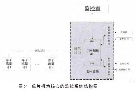 浮子流量計(jì)監(jiān)控系統(tǒng)主要功能是模擬量采集輸出, 數(shù)字量采集輸出,由核心模塊進(jìn)行分析、處理、存儲(chǔ)并和上位機(jī)通信。工業(yè)上常用的監(jiān)控系統(tǒng),從組成結(jié)構(gòu)來(lái)看主要分為PLC為核心的監(jiān)控系統(tǒng)、現(xiàn)場(chǎng)總線為核心的監(jiān)控系統(tǒng)、單片機(jī)為核心的監(jiān)控系統(tǒng)。本設(shè)計(jì)主要采用以單片機(jī)為核心的監(jiān)控方法,該系統(tǒng)使用廣泛,體積小、功耗低、操作方便、設(shè)計(jì)簡(jiǎn)便、成本低,是許多小型監(jiān)控系統(tǒng)的*選。單片機(jī)為核心的監(jiān)控系統(tǒng)結(jié)構(gòu)如圖2所示。本監(jiān)測(cè)系統(tǒng)主要包括現(xiàn)場(chǎng)浮子流量計(jì)組、485總線、主控制板MCU 以及模擬數(shù)字輸出控制模塊。