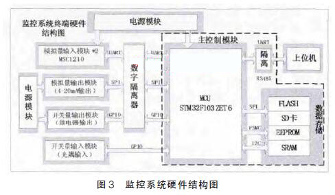 現(xiàn)場(chǎng)浮子流量計(jì)監(jiān)控系統(tǒng)的總體結(jié)構(gòu)如圖2所示。其中硬件系統(tǒng)主要功能是模擬量(溫度、儀表信號(hào))的采集,模擬量(4~20mA 電流)的輸出,開(kāi)關(guān)量的輸入輸出以及遠(yuǎn)距離RS485串行通訊和數(shù)據(jù)存儲(chǔ)。其中監(jiān)測(cè)系統(tǒng)硬件結(jié)構(gòu)如圖3 所示。為增強(qiáng)監(jiān)測(cè)系統(tǒng)的抗干擾能力, 本設(shè)計(jì)采用帶隔離的電源模塊以及數(shù)字隔離器確保系統(tǒng)能夠高效穩(wěn)定工作。