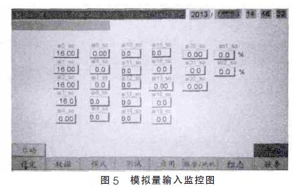 上位機(jī)觸控屏軟件是利用觸控屏供應(yīng)商的組態(tài)軟件設(shè)計(jì)的,作為一個(gè)將運(yùn)用于工業(yè)現(xiàn)場(chǎng)的監(jiān)控設(shè)備,其實(shí)用性和易用性是使用者比較重視的。當(dāng)下位機(jī)的通訊任務(wù)接收到信號(hào)量, 主控制模塊就會(huì)開(kāi)始和上位機(jī)通信。下位機(jī)將采集到處理完整的數(shù)據(jù)傳輸?shù)缴衔粰C(jī)內(nèi),上位機(jī)將其顯示到觸控屏上,使用者可以通過(guò)上位機(jī)了解空壓機(jī)組的實(shí)時(shí)狀態(tài)。圖5 和圖6 就是模擬量和數(shù)字量各個(gè)通道的實(shí)時(shí)值顯示畫(huà)面。
