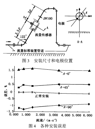 除儀表前直管段可降低彎管影響外,人們還從安裝方式上設(shè)法降低影響的方法。文獻(xiàn)曾報(bào)道電磁流量傳感器電極軸線與鄰近彎管平面成45°傾斜安裝可以減少?gòu)澒苡绊憽H毡竟I(yè)標(biāo)準(zhǔn)B7554“解說(shuō)部分”列有電極軸線與彎管平面垂直、平行、成45°三種安裝方式,在不同長(zhǎng)度直管下的測(cè)量誤差范圍,也說(shuō)明這一效果。