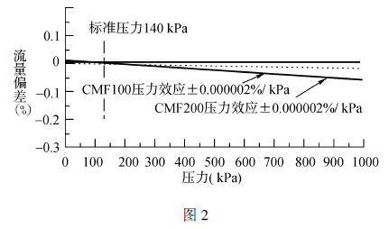 從圖2 中, 我們可以看出壓力對測量準(zhǔn)確度的影響:當(dāng)工藝壓力增大, 會(huì)使流量計(jì)產(chǎn)生一個(gè)負(fù)向偏差, 表現(xiàn)為流量顯示值比實(shí)際值偏小;當(dāng)壓力減小時(shí), 會(huì)使流量計(jì)產(chǎn)生一個(gè)正向偏差, 表現(xiàn)為流量顯示值比實(shí)際值偏大。