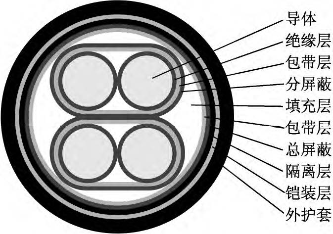 該新型電纜的結(jié)構(gòu)如圖1所示。導體為單股退火鍍錫軟銅線,以提高導體的導電性和防腐蝕性。在導體外繞包一層薄F4(聚四氟乙烯)半導電帶,有利于降低導體和絕緣之間的摩擦起電噪音。絕緣采用材料較為純凈、介電常數(shù)較小、具有一定彈性的聚丙烯絕緣級材料,并采用擠壓式擠出,減小絕緣層與導體的間隙。采用對絞組作為信號傳輸線,由于在兩根傳輸線上感應的電壓接近相等,減小了電壓差值,提高了信號傳輸穩(wěn)定性;對絞組由兩種不同顏色絕緣線芯組成,相鄰線對對絞節(jié)距應不大于100mm。對絞分屏蔽組(即對對絞組進行分屏蔽,每對對絞組外繞包兩層聚酯帶和一層厚0.04mm鋁塑復合帶繞包,內(nèi)置一根7×0.26mm鍍錫銅絞線作引流線)有利于對不同對絞組之間信號串音的抑制和隔離。對絞分屏蔽組同心式絞合成纜,在對絞分屏蔽組間填充非吸濕性材料,以保證纜芯圓整。在成纜纜芯外繞包兩層聚酯帶,再采用鋁塑復合帶繞包,內(nèi)置鍍錫銅線作引流線,以提高電纜電磁屏蔽能力??偲帘螌油鈹D包隔離層(隔離護套),隔離層采用絕緣級低密度聚乙烯材料。隔離層外采用鎧裝層,鎧裝材料為高導磁合金鋼帶,其為強磁材料,可將外來的磁通大部分限制在鎧裝層的外表面上(僅有少部分能進入被屏蔽的空間);鎧裝時對高導磁合金鋼帶采用縱包焊接,確保其形成一連續(xù)圓柱管;鎧裝層可提高電纜抗電磁干擾水平以及對電纜進行加強,減少電纜振動引起的電動勢。外護套采用藍色軟PVC(聚氯乙烯)護層級電纜材料擠包,實現(xiàn)電纜防護。
