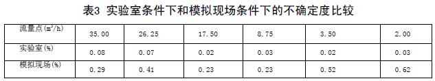 實驗室條件下和模擬現(xiàn)場條件下的不確定度比較(表3)兩次結(jié)果可以看出,兩次實驗各個流量點的不確定度差距非常大。可見,化工污水流量計對安裝條件還是比較苛刻的。