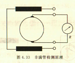 非滿管檢測也是基于電導(dǎo)率檢側(cè)的方法。在圖4.33所示的電磁流量傳感器中,增加了一個(或一對)非滿管檢測電極。當導(dǎo)管內(nèi)液體滿管時,頂部電極與其他電極之間的電阻值很小;而當存在非滿管情況時,頂部電極與導(dǎo)電液體之間有氣體阻隔,所以電極電阻顯著增大,從而做出非滿管判斷。