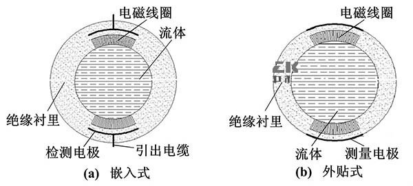 電極與被測流體通過絕緣管形成檢測電容,通過此電容來藕合流量信號。其主要的結(jié)構(gòu)形式按照電極的安裝位置可以分為兩種:電極嵌人測量管的絕緣襯里內(nèi)部(嵌人式)、電極貼在測量管外部(外貼式)。嵌入式結(jié)構(gòu)與普通一寸管污水流量計(jì)結(jié)構(gòu)相似,而外貼式大多是通過陶瓷表面金屬化技術(shù)將電極貼在測量管外。
