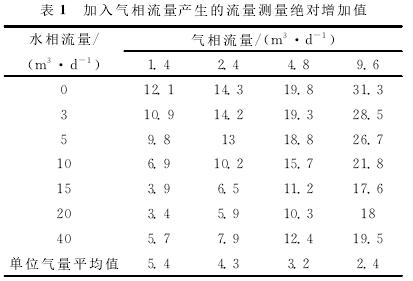 利用清水中渦輪的刻度方程計(jì)算加入不同氣體流量后渦輪響應(yīng)頻率所對應(yīng)的流量,即為加入氣體后的測量流量,再用所得測量流量減去配比的標(biāo)準(zhǔn)水流量,得到氣相加入后測量的絕對增加值,即加入氣相流量產(chǎn)生的測量誤差(見表1)。計(jì)算結(jié)果表明,加入氣體流量后,渦輪的測量流量明顯增加,尤其是液相流量較低時,增加的測量流量更高,氣體對流量測量產(chǎn)生了較大的測量誤差。低氣量下,平均1m3/d的氣量產(chǎn)生的測量誤差大約相當(dāng)于5m3/d(絕對增加值)。