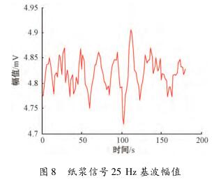 在頻域中對紙漿信號觀察時發(fā)現(xiàn),紙漿信號的漿液噪聲頻帶在零頻率點附近,距離流量信號基波頻率點較遠,對基波幅值和各奇次諧波幅值基本沒有影響,紙漿信號在頻域中的圖形如圖7所示。選擇一組采集的紙漿信號,把其等分成數(shù)段,利用MATLAB計算每段數(shù)據在基波處的幅值并提取保存在一個數(shù)組中,使用繪圖工具畫出來,如圖8所示??梢?,基波幅值在4.7~4.95mV變化,波動較小。因此,提取到的與流量相關的感應電動勢信號幅值會比較穩(wěn)定。