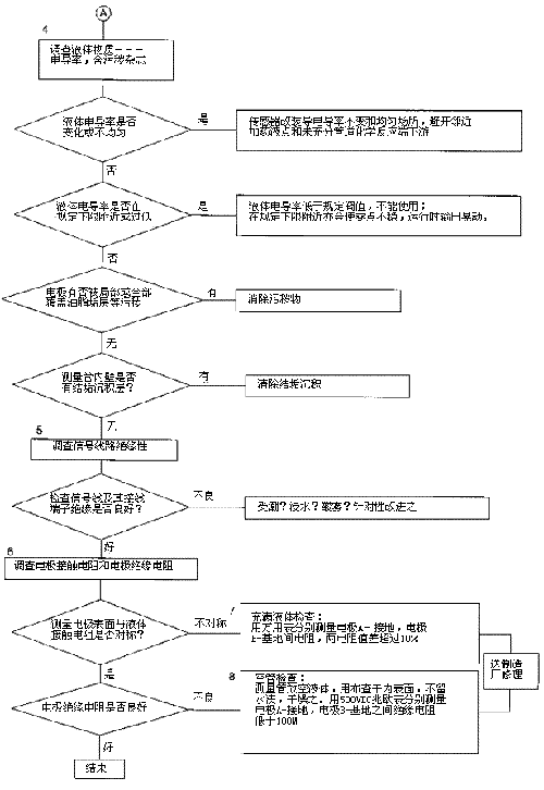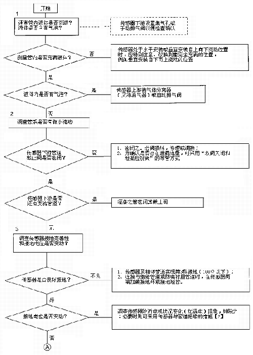 檢查流程圖*5項(xiàng)。信號回路絕緣下降會形成零點(diǎn)不穩(wěn)。信號回路絕緣下降的土要原因足,包極部位絕緣下降所引起的,但也不能排除信號電纜及其接線端子絕緣下降或破壞。因?yàn)橛袝r(shí)候現(xiàn)場環(huán)境十分嚴(yán)酷,稍一疏忽儀表蓋、導(dǎo)線連接處密封不慎,彌漫著潮氣酸霧或粉粒塵埃侵入儀表接線盒或電纜保護(hù)層,使絕緣卜降。信號回路絕緣電阻檢查分別按電纜側(cè)和流量傳感器側(cè)兩郵分進(jìn)行,用兆歐表測試。因信號電纜容易可先做。流量傳感器再分兩次進(jìn)行:充滿液體測黽電極表面接觸電阻和個(gè)管后測量,U極絕緣電阻。