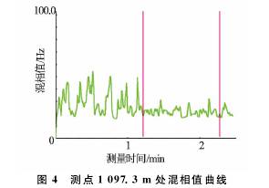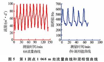 T-××-××1井是大慶油田采油五廠1口水驅(qū)產(chǎn)出井,采用阻抗式含水率計在該井進行了測試。圖3、圖4分別為測點深度1097.3m測量的流量及混相值曲線圖。2min的采樣時間內(nèi),流量及混相值曲線波動劇烈,明顯受井下產(chǎn)氣影響,進行平均值計算時只能取后半段較平穩(wěn)的數(shù)據(jù),因此,測試時需延長測量時間。錄取不同范圍數(shù)值時流量及含水率測量差值較大,流量平穩(wěn)段為14.81m3/d,高值時達到23.52m3/d;取不同測量段的混相值時測量含水率*大相差12%。重復測量得到了相同的測量結(jié)果。由此可見,氣體對流量及含水率測量產(chǎn)生了非常大的測量誤差。