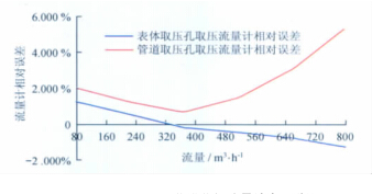 從以上數(shù)據(jù)表和曲線圖中可以看出:空氣流量計(jì)型號(hào)一定的情況下,用表體取壓孔取壓方式檢定流量計(jì)時(shí)流量計(jì)的線性度較好,用管道取壓孔取壓方式檢定流量計(jì)時(shí)流量計(jì)的線性度較差;流量測(cè)點(diǎn)相同的情況下,表體取壓孔取壓檢定方式的流量計(jì)誤差較小,管道取壓孔取壓檢定方式的流量計(jì)誤差較大;兩種取壓方式引起的誤差隨著流量的增大而逐漸增大,在流量為2?。梗埃埃恚常钑r(shí)兩者相差近6.2%,遠(yuǎn)遠(yuǎn)超出了流量計(jì)的準(zhǔn)確度等級(jí)。所以,在空氣流量計(jì)的檢定過(guò)程中,應(yīng)避免在流量計(jì)表體取壓孔以外的地方取壓進(jìn)行檢定。