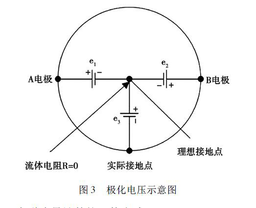 在被測液體與電極和接液部件接觸過程中,電解質(zhì)中的正負(fù)離子會分別作定向運(yùn)動,這會使被測液體在電極和接液部件之間形成電位差,通常將這種現(xiàn)象稱為極化現(xiàn)象。如圖3 所示,理論上來說,兩電極A 和B 對接液部件的電位e1、e2大小相等、方向相反,此時(shí)兩電極的電位差等于零。但是,若兩電極的材質(zhì)或表面狀態(tài)存在差異,此時(shí)A、B 電極之間的電位差就不為零,這就形成了極化電壓,極化電壓與共模狀態(tài)的電壓e3一起疊加在流量信號中,被輸入轉(zhuǎn)換器的差動放大器。當(dāng)極化電壓過大,則會對差動放大器的輸入端造成較大影響,導(dǎo)致信號無法放大或流量信號的輸出波動過大,從而降低了衛(wèi)生型卡箍電磁流量計(jì)的測量精度。