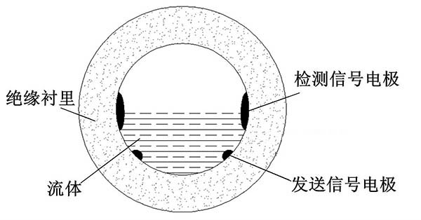 ③利用阻抗或信號衰減研制的非滿管工業(yè)污水流量計。這種結(jié)構(gòu)的非滿管工業(yè)污水流量計是當(dāng)前國內(nèi)研究的方向之一。其結(jié)構(gòu)是流量管底部貼一對信號發(fā)射電極,在流量管中間貼信號接收電極。由于信號在流體中傳播會產(chǎn)生衰減,且傳播時間越長,衰減越多,因此通過信號接收電極接收到的信號衰減量即可得知液面高度;同時該電極還能測量流體切割磁感線產(chǎn)生的電動勢,以此達(dá)到測量非滿管流量的目的。阻抗式或信號衰減非滿管工業(yè)污水流量計結(jié)構(gòu)簡圖如圖5所示。