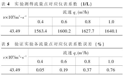實(shí)驗(yàn)中每個(gè)流量點(diǎn)均進(jìn)行3次測量,(j=1,2,3),3次測量的平均儀表系數(shù)作為此流量點(diǎn)的儀表系數(shù)Ki(i=1,2,3,4,5),各流量點(diǎn)儀表系數(shù)*小值與*大值的平均值,作為傳感器的儀表系數(shù)。