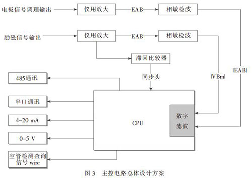 電極檢測(cè)出的微弱感應(yīng)電動(dòng)勢(shì)E, 先經(jīng)前置放大器的放大和噪聲抑制而成為大幅度低阻抗的電壓信號(hào)。此信號(hào)經(jīng)相敏檢波后,給CPU 進(jìn)行數(shù)字濾波、處理和控制,通過(guò)利用雙線性變換法將模擬的二階巴特沃斯低通濾波器轉(zhuǎn)換為數(shù)字式濾波器,既簡(jiǎn)化電路設(shè)計(jì),且可靠性高、穩(wěn)定性好。通過(guò)編寫(xiě)軟件CPU 能對(duì)放大器的溫度漂移及零點(diǎn)漂移給予補(bǔ)償, 并在測(cè)量的全量程范圍內(nèi)分10 段對(duì)信號(hào)進(jìn)行非線性修正,使得測(cè)量值更好地?cái)M合真實(shí)數(shù)據(jù)??展軝z測(cè)電路上,CPU 作為從控制器。當(dāng)主控制電路上發(fā)出空管檢測(cè)查詢信號(hào)wire, 從控制器進(jìn)行識(shí)別后接收并判斷出查詢什么信號(hào),然后產(chǎn)生應(yīng)答信號(hào)上傳至主控芯片輸出顯示;當(dāng)檢測(cè)為空管信號(hào)時(shí), 從CPU 發(fā)出的zero 信號(hào)通過(guò)控制MOS 管開(kāi)關(guān)來(lái)關(guān)斷流速輸出。在應(yīng)用中,對(duì)于微弱信號(hào)的放大及提取還需注意PCB 板設(shè)計(jì)時(shí)EMI 電磁屏蔽考慮,屏蔽來(lái)自空間磁場(chǎng)的干擾、周邊設(shè)備的輻射造成的干擾和板內(nèi)之間的干擾,如數(shù)模分離、強(qiáng)弱電分離等等。