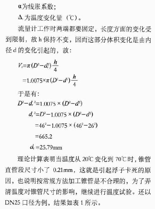 為了保持聚四氟乙烯零件尺寸的穩(wěn)定性,規(guī)定其溫度應(yīng)用范圍是70℃以下。在試制的初始階段,用常規(guī)加工方法,即按圖紙尺寸進(jìn)行錐管和浮子的加工,可以發(fā)現(xiàn),在常溫下工作正常的浮子在高溫試驗(yàn)中出現(xiàn)了卡死現(xiàn)象,反復(fù)的試驗(yàn)都得到同樣的結(jié)果。實(shí)際測(cè)量表明:浮子尺寸變化不大,因此推斷是由于錐管尺寸的變化引起卡死現(xiàn)象。通過理論計(jì)算,得出結(jié)論,以利改進(jìn)。