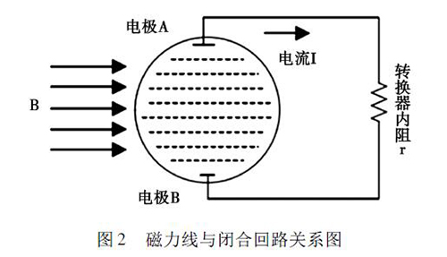 2. 1 正交干擾鹽水流量計(jì)的磁路系統(tǒng)包含有兩個(gè)勵(lì)磁線圈,而導(dǎo)管內(nèi)的液體與傳感器電極及轉(zhuǎn)換器結(jié)構(gòu)組成了一個(gè)閉合的回路,如圖2 所示。理論情況下,磁力線( 圖中B) 應(yīng)與閉合回路相平行,但是由于裝配過(guò)程中的誤差,導(dǎo)致磁力線不可能完全平行于這一閉合回路,出現(xiàn)部分磁力線成一定角度穿過(guò)回路的現(xiàn)象,這引起了即使沒(méi)有液體流動(dòng)的情況下,傳感器的電極上也會(huì)產(chǎn)生感應(yīng)電動(dòng)勢(shì),就形成了正交干擾的基本形式。