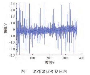 針對(duì)污泥計(jì)量表測量水煤漿時(shí)出現(xiàn)較大波動(dòng),甚至回零這一問題,特去某煤化工企業(yè)甲醇分公司進(jìn)行現(xiàn)場數(shù)據(jù)采集。該公司所使用的對(duì)置式四噴嘴氣化有4個(gè)噴嘴,噴嘴管道口徑為125mm,管中水煤漿流量基本穩(wěn)定在19m³/h(流速約為0.48m/s)。每條噴嘴煤漿線上安裝了3臺(tái)污泥計(jì)量表,每臺(tái)污泥計(jì)量表由傳感器和變送器兩部分組成。選擇其中1條水煤漿管線上的1臺(tái)污泥計(jì)量表進(jìn)行數(shù)據(jù)采集,因?yàn)樵撆_(tái)污泥計(jì)量表測量結(jié)果波動(dòng)大,甚至出現(xiàn)回零的現(xiàn)象。將課題組研制的基于DSP的電磁流量變送器的信號(hào)線和勵(lì)磁線接到該電磁流量傳感器的電極和勵(lì)磁線圈上,組合成完整的污泥計(jì)量表,進(jìn)行水煤漿數(shù)據(jù)采集。使用的電磁流量變送器是以TI公司DSP芯片TMS320F28335為核心,采用高頻勵(lì)磁方案,其硬件主要包括勵(lì)磁控制系統(tǒng)和信號(hào)采集處理系統(tǒng),具體的模塊有勵(lì)磁驅(qū)動(dòng)模塊、信號(hào)調(diào)理采集模塊、信號(hào)處理控制模塊、人機(jī)接口模塊、通信模塊及電源管理模塊。信號(hào)調(diào)理采集模塊中的調(diào)理電路對(duì)一次儀表輸出的信號(hào)進(jìn)行放大和濾波,截止頻率是2kHz,放大倍數(shù)約為230倍。通過NI公司USB-6216型號(hào)的數(shù)據(jù)采集卡進(jìn)行數(shù)據(jù)采集,把調(diào)理電路的輸出端連接到數(shù)據(jù)采集卡的一個(gè)差分輸入端,并設(shè)置數(shù)據(jù)采集卡工作在差分的測量模式,設(shè)置采集卡的采樣頻率為10kHz。采集多組水煤漿信號(hào)數(shù)據(jù),每組數(shù)據(jù)的時(shí)間長度為5min。