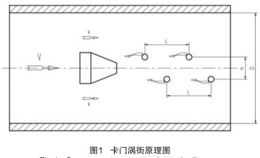 插入式煙氣流量計(jì)實(shí)現(xiàn)流量測(cè)量的理論基礎(chǔ)是流體力學(xué)中**的“卡門渦街”原理,在流動(dòng)的流體中裝置一個(gè)非線性三角柱形體,即渦旋發(fā)生體,如圖 1 所示。當(dāng)流體沿渦旋發(fā)生體繞流時(shí),會(huì)在渦旋發(fā)生體下游產(chǎn)生兩列不對(duì)稱,但有規(guī)律交替地分離釋放出一系列漩渦束,只有當(dāng)兩渦漩列之間的距離 h 和同列的兩渦漩之間的距離 L 之比滿足 h/L=0.281 時(shí),所產(chǎn)生的渦街才是穩(wěn)定的。
