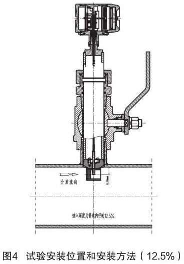 根據(jù)中華人民共和國(guó)機(jī)械行業(yè)標(biāo)準(zhǔn):JB/T9249-2015《煙氣流量計(jì)》進(jìn)行插入式煙氣流量計(jì)的研制與設(shè)計(jì)。在試驗(yàn)過(guò)程中,因?yàn)槔碚撗芯坎怀浞郑偌由辖?jīng)驗(yàn)不足,采用插入深度是按照以往其它產(chǎn)品(插入式電磁流量計(jì))的經(jīng)驗(yàn),以插入深度為現(xiàn)場(chǎng)管道內(nèi)徑的 12.5% 進(jìn)行試驗(yàn),其對(duì)介質(zhì)流量的檢測(cè)值與同種規(guī)格管道法蘭式結(jié)構(gòu)的煙氣流量計(jì)進(jìn)行比較,偏差值較大、儀表準(zhǔn)確度無(wú)法滿足設(shè)計(jì)要求。試驗(yàn)安裝位置和安裝方法如圖 4 所示。