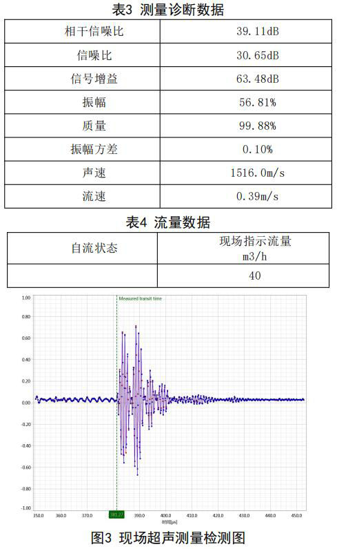 在機(jī)組自流補(bǔ)給水狀態(tài):同樣采用德國FLUEX 高精度外夾式超聲波流量計作為標(biāo)準(zhǔn)流量計,測量 基礎(chǔ)數(shù)據(jù):管道外徑276.93mm,管壁厚度12.40mm, 采用兩聲程169mm傳感器安裝距離,通過對超聲波流量計信號分析與診斷(數(shù)據(jù)見表3和表4),超聲 波流量計測量狀態(tài)符合條件,開始測量,打開凝汽 器入口閥門,流量測量情況如下