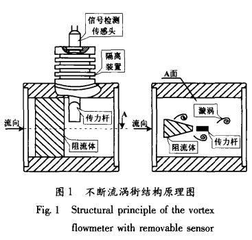 不斷流渦街同樣是以卡門渦街原理為依據(jù)測量流體流速的,但不斷流渦街表體已經(jīng)在結構上有了質(zhì)的改變。如圖1所示,它將普通渦街單一的信號檢測傳感頭改變?yōu)閭髁U與信號檢測傳感頭兩部分,并通過隔離裝置完全隔離。當表體中流過流體并產(chǎn)生漩渦時,由傳力桿檢測漩渦的變化,并以力的形式傳遞給信號檢測傳感頭,完成了力信號到電信號的轉(zhuǎn)換過程。雖然傳力桿與流體直接接觸,但其本身只是進行力傳輸?shù)母軛U,因此,只對外形尺寸及鋼材選擇上具有要求。而信號檢測傳感頭是通過隔離裝置與流體完全密閉隔離的,再加上隔離裝置本身具有的散熱功能,使得信號檢測傳感頭的使用溫度要遠遠低于流體的實際溫度,從而有效地提高了普通信號檢測傳感頭的可測介質(zhì)溫度。同時,不斷流渦街在進行維修更換信號檢測傳感頭時,并不影響工藝管道內(nèi)流體的流動,真正實現(xiàn)了信號檢測傳感頭的不斷流拆裝維護。