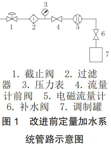 工廠的香料廚房系統(tǒng)為國內煙機公司 2004 年設計制造,其定量加水系統(tǒng)主要由水源、生活污水流量計、加水管路元件和控制程序這四部分組成,改進前管路示意圖如圖 1 所示。