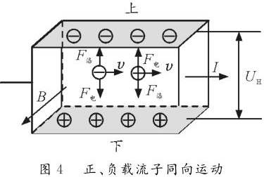 情形2:正、負載流子反向運動。如圖3所示,長方體玻璃水槽中盛有NaCl的水溶液,水槽左、右側壁內側各裝一導體片,在溶液中通入水平向右的電流,勻強磁場B垂直紙面向外。NaCl溶液中既有正離子,又有負離子,根據(jù)左手定則可判斷正離子受到向下的洛倫茲力,故向下運動并堆積。同理,負離子也受到指向下的洛倫茲力,也向下運動并堆積。由于正負離子均向下側面堆積,故上下兩側面的電勢均為零,但下側面處離子濃度大于上側面離子濃度。