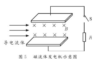 【例1】圖5為磁流體發(fā)電機示意圖。設兩金屬板間的距離為d,兩極板間勻強磁場的磁感應強度為B。等離子體垂直進入磁場的速度為v,單個離子所帶的電荷量為q。離子通道(即兩極板內所圍成的空間)的等效電阻為r,負載電阻為R。則下列判斷正確的是( ?。?br /> A。該發(fā)電機的電動勢E=Bdv
