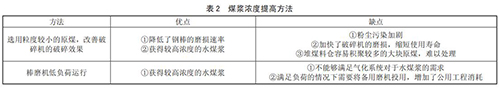 根據(jù)蒸汽流量計(jì)跑漿原因可以了解到,在保證蒸汽流量計(jì)不存在跑漿情況下,制備高品質(zhì)煤漿需要滿足兩點(diǎn)要求,即較小入口原煤粒度和較低磨機(jī)負(fù)荷,保證原煤在磨機(jī)內(nèi)部有較長(zhǎng)停留時(shí)間與充足滾筒篩過濾面積 . 通用的方法一般有以下兩種,如表 2 所示。