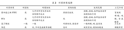 智能型防腐電磁流量計要根據(jù)被測流體的溫度、壓力、速度以及含固顆粒的硬度、含量和粒徑大小來決定測量管內(nèi)襯的材質(zhì)。該濕法磷酸裝置中,智能型防腐電磁流量計測量管襯里材質(zhì)的種類見表 2。