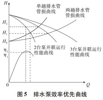 當(dāng)執(zhí)行多臺(tái)排水泵同時(shí)運(yùn)行時(shí),通過(guò)排水泵特性曲線(xiàn)與管路特性曲線(xiàn)的比較,選擇非常好的匹配排水泵與排水管數(shù)量,保證排水泵在非常好的新效率點(diǎn)運(yùn)行。如圖 5 所示。