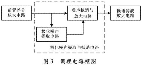 根據(jù)前饋控制的自適應(yīng)極化噪聲抵消原理,設(shè)計了信號調(diào)理電路2,以實現(xiàn)極化噪聲的濾除。信號調(diào)理電路2主要包括前置差分放大電路、極化噪聲提取與抵消電路、低通濾波放大電路三部分。調(diào)理電路如圖3所示。