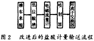 該系統(tǒng)工藝復(fù)雜,操作困難,安全性低,在一次向高位酸槽壓送濃鹽酸的過程中,曾發(fā)生過鹽酸噴出傷人的事故。因此對(duì)整個(gè)系統(tǒng)進(jìn)行了改進(jìn)(見圖2)