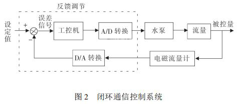 通信控制系統(tǒng)由工控機(jī)、變頻器、水泵、數(shù)據(jù)采集卡、煤油流量計等組成。在整個熱量表耐久性試驗裝置中,煤油流量計與被試驗熱量表串聯(lián)在試驗管路中。系統(tǒng)設(shè)定流量值 qs,通過工控機(jī)發(fā)送信號給變頻器,來控制水泵運(yùn)轉(zhuǎn),系統(tǒng)通過研華數(shù)據(jù)采集卡 PCI1711 將采集到的煤油流量計當(dāng)前瞬時流量值反饋給工控機(jī),工控機(jī)將返回流量值與設(shè)定流量值qs進(jìn)行比較,從而確定是否需要重新調(diào)整變頻器頻率控制水泵轉(zhuǎn)速。此過程是一個完整的閉環(huán) PID 控制過程,其閉環(huán)控制過程如圖 2 所示。 2. 2 管路切換系統(tǒng)管路切換主要由冷熱水箱、水泵、開關(guān)閥等組成。要實現(xiàn)熱量表耐久性 4000 次冷熱沖擊試驗,需要實時控制管路中熱水與冷水的交替使用。