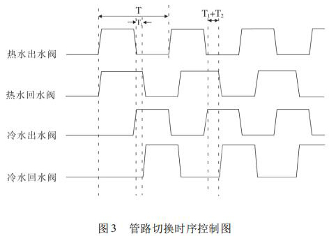 開始試驗,冷熱水箱預(yù)先達(dá)到試驗要求溫度,水泵運(yùn)轉(zhuǎn)調(diào)節(jié)管路流量至設(shè)定值。系統(tǒng)給定信號控制四個開關(guān)閥(熱水出水閥、熱水回水閥、冷水出水閥、冷水回水閥) 的打開與關(guān)閉,實現(xiàn)冷熱水的切換。熱水沖擊時,熱水出水閥與熱水回水閥打開的同時,冷水出水閥與冷水回水閥關(guān)閉,確保試驗管路熱水沖擊;同理,冷水沖擊時,冷水出水閥與冷水回水閥打開,熱水出水閥與熱水回水閥關(guān)閉,確保試驗管路冷水沖擊。系統(tǒng)通過四個開關(guān)閥對管路進(jìn)行時序控制,達(dá)到管路切換的目的,很好地實現(xiàn)了 4000次冷熱循環(huán)沖擊試驗。其具體的管路切換控制時序圖如圖 3 所示。