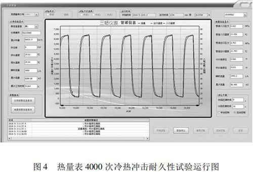 本文研究的 4000 次冷熱沖擊試驗的實現(xiàn)具有以下特點: (1)基于“工控機(jī) +水泵 + 煤油流量計”的閉環(huán)控制系統(tǒng),實現(xiàn)了流量自動反饋調(diào)節(jié),滿足試驗要求; (2)通過四個開關(guān)閥的時序切換,自動控制試驗溫度,很好的完成了 4000 次溫度沖擊試驗; (3)通過“工控機(jī) + 數(shù)據(jù)數(shù)據(jù)采集卡”的數(shù)據(jù)采集系統(tǒng),實時監(jiān)控試驗過程中的流量、溫度、壓力等相關(guān)參數(shù),實現(xiàn)試驗方式的自動控制,并能對試驗數(shù)據(jù)進(jìn)行分析與評定。 (4)試驗的全過程為智能自動化,可無人員留守看護(hù)。試驗結(jié)果可直接反映出熱量表在長時間運(yùn)行后的可靠性。為我國熱量表耐久性試驗研究提供檢測手段,為促進(jìn)產(chǎn)品質(zhì)量提升做好技術(shù)保障。