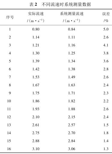 由表 2 測量數(shù)據(jù)可知,系統(tǒng)在測量低流速液體時(流速小于 1 m/s)誤差較大,達到 5%,當(dāng)待測液體的流速增大時(大于 1.4 m/s),誤差逐漸減小,基本維持在 3%以內(nèi)。由此可見系統(tǒng)具有較高的檢測精度,尤其是當(dāng)管道中的液體流速較高時,系統(tǒng)的檢測誤差不超過 3%,達到了設(shè)計預(yù)期。