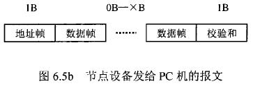 花生油流量計等節(jié)點設(shè)備和C機通信的過程中,由地址幀、命令幀、數(shù)據(jù)幀、校驗和可組成各種功能不同的報文。由于采用主從工作方式來實現(xiàn)通信,花生油流量計等節(jié)點設(shè)備僅能接收并執(zhí)行PC機發(fā)送來的控制命令,而不能發(fā)送命令給PC機。因此,由PC機發(fā)往流量計等節(jié)點設(shè)備的報文一般包括一個地址幀,一個命令幀,若干個數(shù)據(jù)幀和一個校驗和,其報文格式圖.6a5所示;而由流量計等節(jié)點設(shè)備發(fā)往PC機的報文一般包括一個地址幀,若干個數(shù)據(jù)幀和一個校驗和,其報文格式如圖6.5b所示。