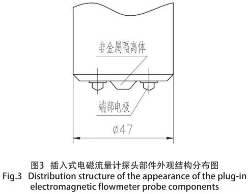 通過大量的試驗,對探頭端部外型結構亦采用特殊設計,從而消除兩個電極之間的擾流現(xiàn)象,同時亦消除因通電產(chǎn)生磁場,導致兩個電極吸附介質(zhì)中的鐵屑而影響測量精度和死區(qū)效應,增強了輸出信號的穩(wěn)定性,從而提高傳感器準確度和抗干擾性。通過結構的優(yōu)化設計,使用壽命更長,dn80泥漿流量計探頭局部,如圖 3 所示。