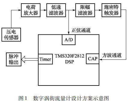 本文設(shè)計的基于 TMS320F2812 DSP 的數(shù)字煙氣流量計的信號處理系統(tǒng)由前置放大電路和數(shù)字信號處理電路兩部分組成。本文選用的前置放大電路即為目前被廣泛應(yīng)用的普通煙氣流量計的前置放大電路,主要由電荷放大電路、低通濾波電路、限幅濾波電路和施密特觸發(fā)電路組成; 對于經(jīng)壓電傳感器測得的渦街信號采用了頻域分析和時域分析相結(jié)合的方式,即由前置放大電路和數(shù)字信號處理電路相配合。時域分析通道利用 DSP 事件管理器的捕獲模塊,對前置放大電路輸出的方波進(jìn)行頻率計算,然后再由 DSP 事件管理器通用定時器的比較輸出模塊進(jìn)行脈沖輸出。頻域分析通道即 DSP對低通濾波電路輸出的疊加了許多噪聲的正弦信號進(jìn)行 A/D 采樣,再利用 DSP 對 A/D 采樣的結(jié)果進(jìn)行頻譜分析,從而得出此時渦街信號的頻率,*后由 DSP 通用定時器的比較輸出模塊進(jìn)行脈沖輸出。系統(tǒng)設(shè)計方案示意圖如圖 1 所示。