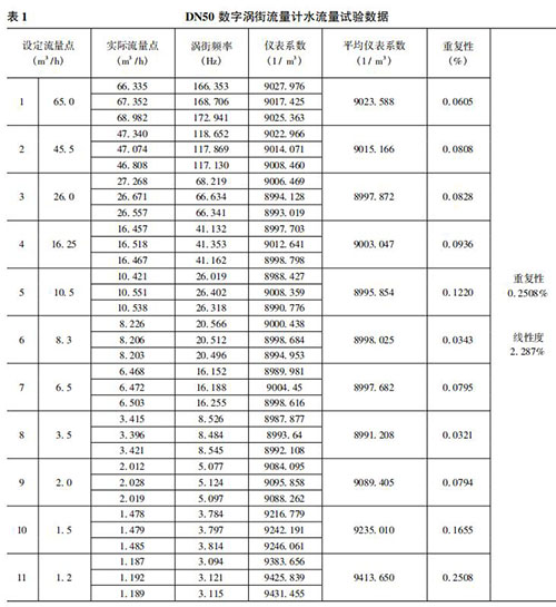 將本文實現(xiàn)的數(shù)字煙氣流量計在上述 50mm 口 徑( 簡稱 DN50) 的水流量試驗裝置上進(jìn)行試驗。先在其正常流量范圍內(nèi)進(jìn)行試驗,流量從大到小逐漸降低,之后不斷探求其所能測量的*小流量。每個流量點試驗三次,計算其重復(fù)性、平均儀表系數(shù)和線性度。水流量試驗數(shù)據(jù)如表 1 所示。