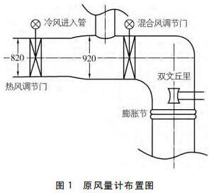 從流量測量角度講,影響流場的主要為熱風調(diào)門、擴管、彎頭以及一次冷風的混入,閘板門和混合風調(diào)門由于運行時處于全開狀態(tài),影響可忽略,目前使用了單點雙文丘里管的測量方式,有以下問題: