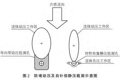 二氧化氯流量計采用拋物面導向型結(jié)構(gòu)作為動壓測點,采用對稱自補償型式的靜壓測點,可以有效地解決來流方向偏流時信號的穩(wěn)定采集,來流偏離管道軸線時,可以維持輸出差壓基本不變,如圖2所示。
