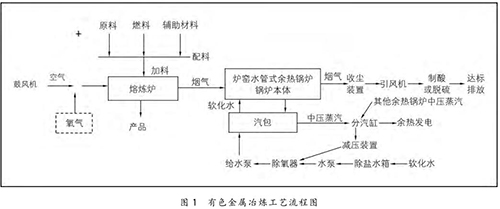 在有色金屬冶煉過程中,將原料、燃料和輔助材料根據(jù)熱平衡原理按一定比例進行配料,配料后的物料與空氣或高含氧的混合空氣在熔煉爐中進行氧化或還原反應(yīng),熔煉出有色金屬產(chǎn)品。同時,在熔煉過程中會產(chǎn)生大量的高溫煙氣( 1200 ℃ 左右),高溫煙氣經(jīng)過余熱鍋爐時,與余熱鍋爐水側(cè)的軟化水進行熱量交換,煙溫迅速降至 250℃ 以下,再經(jīng)收塵、制酸或脫硫裝置進一步收塵、降溫、凈化,*終達標排放。余熱鍋爐水側(cè)的軟化水經(jīng)熱量交換后產(chǎn)生中壓飽和蒸汽(4 MPa 左右),送至余熱發(fā)電機組發(fā)電。具體的工藝流程如圖 1 所示。