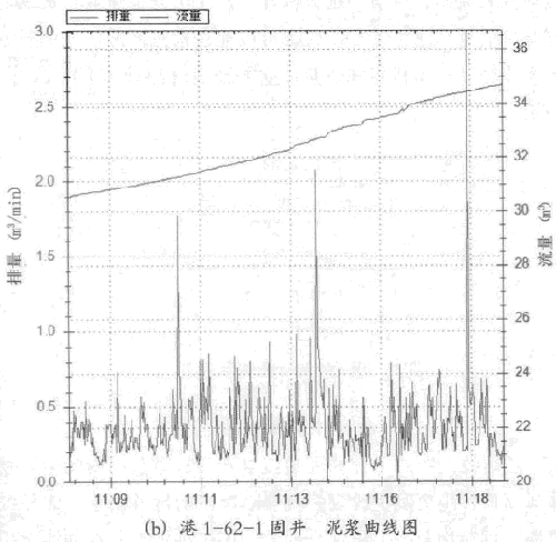 在固井全程的曲線中,也可以發(fā)現開始固井的時候.泥漿排量雜波較小,究其原因是剛開始固并時,泥漿管線剛泄壓,管線中還是充滿了液體,雖然振動強度雷同.但是葉片有阻尼,振幅較小.對其影響也較小。例如曲線圖的11;03: 00-11: 03: 53之間的泥漿排量沒有雜波。在港1-62-1固井過程中,水泥漿打了413澎,結果本應該是0的泥漿,卻走數了23.0 m',其影響可謂巨大.并非通過普通的濾波或切除所能排除,必須執(zhí)行一個特殊算法。