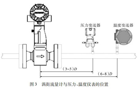 蒸汽流量計(jì)的口徑如果與工藝管道相同,不能滿足流量儀表要求時(shí),或者在此流速下測量準(zhǔn)確度不能保證時(shí),需要縮小儀表口徑,從而提高管內(nèi)流速,保證測量精度。上下游必須有足夠的直管段,若傳感器安裝點(diǎn)的上游在同一平面上有 2 個(gè) 90°彎頭時(shí),上游直管段≥25D,下游直管段≥5D。根據(jù)測量的需要,需在蒸汽流量計(jì)附近測量壓力和溫度時(shí),測壓點(diǎn)應(yīng)在傳感器下游的( 3 ~ 5) D 處,測溫點(diǎn)應(yīng)在傳感器下游的( 6 ~ 8) D 處,如圖 3 所示。