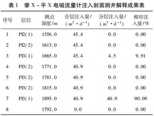 2017 年 9 月在大慶油田采油八廠肇 X - 平 X 水平井注水井中*次進(jìn)行了水平井注入剖面測(cè)井現(xiàn)場(chǎng)試驗(yàn)。該井斜深2 055. 42 m,水平段長(zhǎng)度為568. 46 m,試驗(yàn)?zāi)康氖峭ㄟ^(guò)注入剖面測(cè)井了解該井各層段的注水情況,同時(shí)對(duì)水平井測(cè)井工藝、儀器的適用性、井下?tīng)恳骷熬谳o助裝置等設(shè)備的工作有效性和可靠性進(jìn)行評(píng)價(jià)?,F(xiàn)場(chǎng)試驗(yàn)中,在密閉條件下錄取到了該井的注入剖面測(cè)井資料,進(jìn)行了重復(fù)測(cè)量,重復(fù)測(cè)量結(jié)果在誤差允許范圍內(nèi),測(cè)井成果見(jiàn)表 1。該井施工壓力 6. 0 MPa,注入量45. 4 m3 /d,有 7 個(gè)射孔層,分 8 個(gè)測(cè)點(diǎn)測(cè)量,2 個(gè)層有吸入顯示,其中,P13( 1) ( 1 734 ~ 1 767 m) 層絕對(duì)吸入量4. 5 m3 /d,相對(duì)吸入量為9. 91 %,P13( 1) ( 1 899 ~1 943 m)層絕對(duì)吸入量 40. 9 m3 /d,相對(duì)吸入量為 90. 09% ,測(cè)井成果見(jiàn)表 1。通過(guò)與甲方的交流,再結(jié)合該井的動(dòng)靜態(tài)資料及周圍井的工作狀況,采油廠的地質(zhì)人員認(rèn)為本次測(cè)井結(jié)果能比較準(zhǔn)確地反映該井的注入情況。