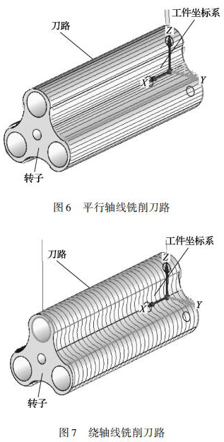 三葉轉(zhuǎn)子的曲面是由多條直線組成的直紋面,加工三葉轉(zhuǎn)子這種高精度的直紋曲面必須采用四軸或五軸聯(lián)動的數(shù)控機(jī)床。三葉轉(zhuǎn)子的銑削方式有刀具路徑平行軸線銑削、繞軸線銑削兩種刀具路徑。平行軸線銑削原理為: 刀具在轉(zhuǎn)子曲面上沿 X軸從轉(zhuǎn)子的一端移動到另一端銑出一條直線,銑削下一點(diǎn)位時(shí)旋轉(zhuǎn) A 軸 Z 軸聯(lián)動再次從轉(zhuǎn)子一端銑削到另一端,采用往復(fù)銑削直到完成整個轉(zhuǎn)子曲面,刀具路徑如圖 6 所示。繞軸線銑削原理為: 刀具在轉(zhuǎn)子曲面上 AZ 軸聯(lián)動刀具繞 A 軸軸線銑削,銑削下一點(diǎn)位時(shí)移動 X 軸,再次 AZ 軸進(jìn)行聯(lián)動銑削,采用往復(fù)銑削直到完成整個轉(zhuǎn)子曲面,刀具路徑如圖 7 所示。由于繞軸銑削需要 AZ 軸聯(lián)動切削,而數(shù)控機(jī)床可以達(dá)到的進(jìn)給率是由*慢的軸決定的,所以,這種刀具路徑在精加工高速銑削時(shí)并不適用。