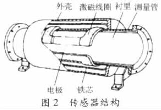 電磁流量計由流量傳感器和轉換器兩部分組成。傳感器典型結構示意如圖2,測量管上下裝有激磁線圈,通激磁電流后產(chǎn)生磁場穿過測量管,一對電極裝在測量管內(nèi)壁與液體相接觸,引出感應電勢,送到轉換器。激磁電流則由轉換器提供。