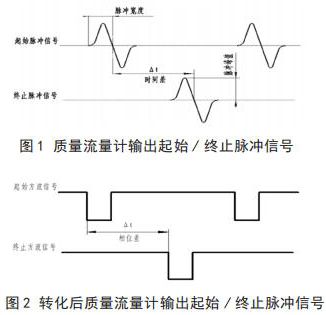 將智能型電磁流量計(jì)流量與相關(guān)測(cè)試設(shè)備連接起來(lái),就可以進(jìn)行智能型電磁流量計(jì)的校準(zhǔn),時(shí)間差△ t 由專用試驗(yàn)測(cè)試設(shè)備可以測(cè)出。起始脈沖信號(hào)和終止脈沖信號(hào)如圖 1 所示。經(jīng)過專用試驗(yàn)測(cè)試設(shè)備信號(hào)轉(zhuǎn)化后的信號(hào)方波如圖 2 所示。